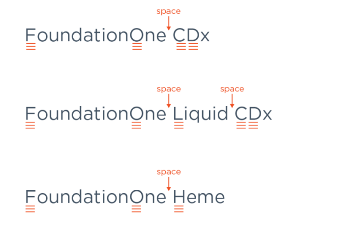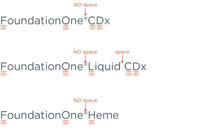 The first use of the product name on a page must always include its registration mark (®) after “FoundationOne” and no space between it and the following word. Subsequent uses of the product name do not contain the ® after “FoundationOne” and instead contain a space between One and the following word. The words “FoundationOne” are both capitalized and contain NO space between them.